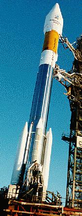 | Delta 3 - Delta 3 on the pad before its first launch attempt. Credit: Boeing. 12,783 bytes. 122 x 374 pixels. |