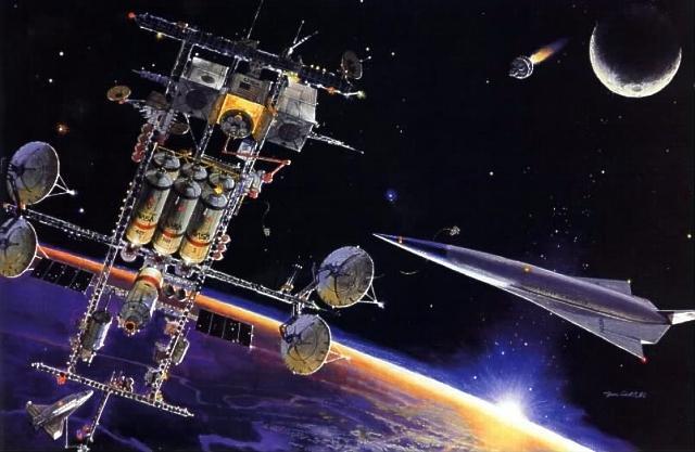 ![]() | Dual Keel Station/86 - Dual Keel Space Station - Bridge To Other Worlds - 1986. This illustration from the National Space Commission's "Pioneering the Space Frontier" report depicts an early 21st century "Dual Keel" type spaceport in Earth orbit. At right is the "Orient Express" National Aerospace Plane proposed by President Reagan in 1986 while a space tug is returning from lunar orbit (top right).. This illustration from 1986 depicts the assembly of two manned Mars spacecraft at the "Dual Keel" Space Station. Credit: NASA via Marcus Lindroos. 43,205 bytes. 540 x 480 pixels. |