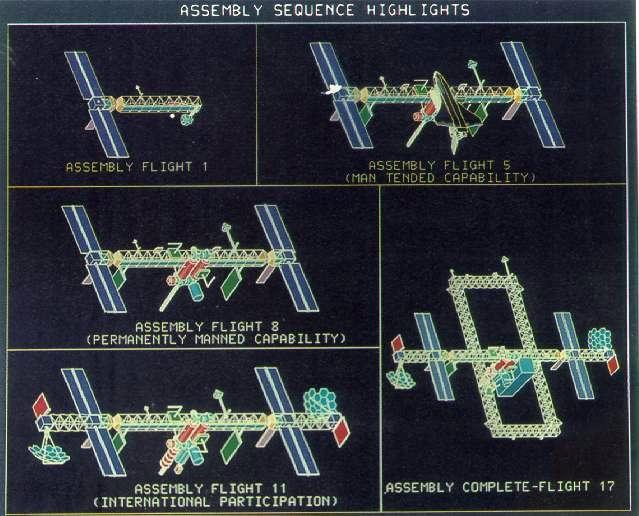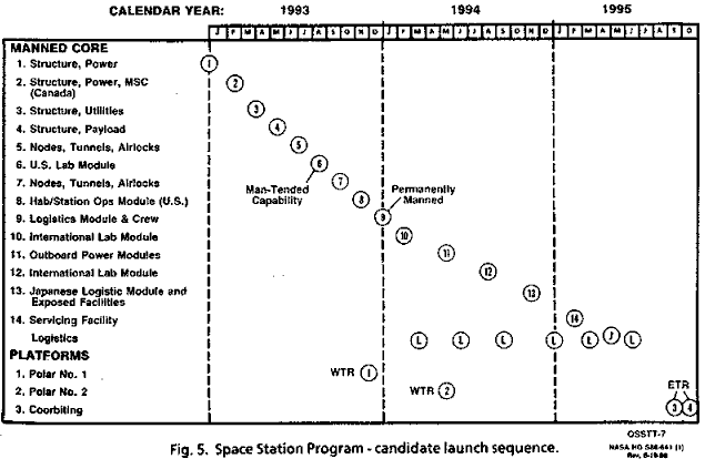 According to the May '86 Space Station assembly sequence, the first element would be launched in January 1993. The Station would support man-tended operations after the sixth Shuttle assembly mission in August 1993 and be ready for permanent occupation after the ninth mission in January 1994. Initial Operating Capability (IOC) would be achieved after 21 flights -- twice as many as the 1984 estimate.