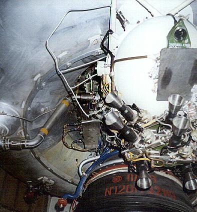 ![]() | Engine 11D68 detail - Closeup view of the 11D68 Block D lunar crasher stage showing detiail of the BOZ orientation/ullage thrusters that control the stage during coast, restart, and maneuver. Credit: © Mark Wade. 43,376 bytes. 393 x 424 pixels. |