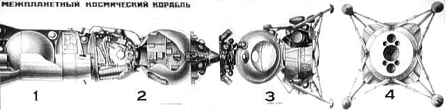 ![]() | LOK-LK Drawing - Unusual diagram of LOK and LK lunar craft in docked configuration, with bottom view of LK. Korolev School. Credit: Jakob Terweij. 22,627 bytes. 639 x 158 pixels. |