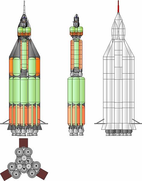 | UR-700 Cutaway - UR-700 lunar landing launch vehicle - From left: cutaway and bottom views; cutaway of core vehicle after six external stage one modules and shrouds were jettisoned; external view. The cutaway shows the arrangement of N2O4 oxidiser tanks (green) and UDMH fuel tanks (orange). The six outer 4.1 m diameter modules contained fuel and oxidizer tanks for stage 1 and fuel or oxidiser tanks for the three core modules. After propellant depletion, the six outer modules would separate, leaving the three core modules to continue their burn. The third stage, based on the Proton first stage, placed the LK-700 spacecraft into a 200 km earth orbit. The LK-700 was equipped with four nearly identical clustered stages and a lunar landing/ascent stage. The three outer stages fired to place the spacecraft on a translunar trajectory. The inner core stage was used for midcourse corrections, braked the spacecraft into lunar orbit, and then again until it was just above the lunar surface. The ascent stage performed the final soft landing on the moon and then, using the landing legs as a launch platform, launched the LK-700 capsule back towards the earth. Credit: © Mark Wade. 38,472 bytes. 471 x 600 pixels. |
