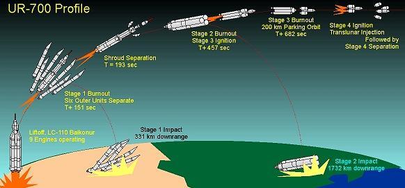 | UR-700 Profile - UR-700 Launch Profile. At liftoff, nine engines - six on the six outer stage 1 modules, and three on the three core modules - fired. During the stage 1 burn, the three engines of the core modules were fed by propellants in forward tanks of the outer six modules. Therefore the Stage 2 core burn started with full tanks in the core modules. Stage 3, a modification of the Proton first stage, placed the 151 tonne LK-700 spacecraft into a 200 km earth parking orbit. Credit: © Mark Wade. 28,559 bytes. 582 x 271 pixels. |