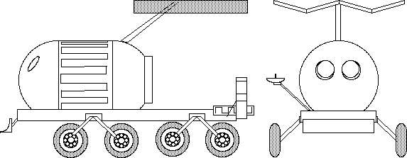 Lunar rover for the Lunar Expedition. The rover provided pressurized quarters for 2 crew, allowing trips up to 200 km from the lunar base at a top speed of 5 km/hr. The 2.25 tonne generating station provided 8 kw of solar power to run the motor. Each 12 day trip would use 200 kg of life support consumables.