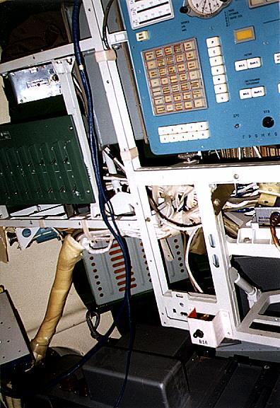 ![]() | LOK Orbital Module - LOK Orbital Module control station above hatch entrance. Main controls are on the blue panel; the green panel are radio controls. Credit: © Mark Wade. 60,786 bytes. 396 x 577 pixels. |