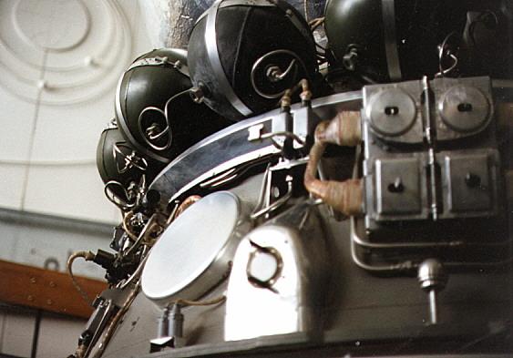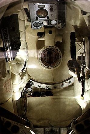 The cosmonaut could also take manual control of the spacecraft and manually re-enter. This was done by using the ingenious Vzor periscope device mounted on the floor of the cabin. This had a central view and eight ports arranged in a circle around the center. When the spacecraft was perfectly centered in respect to the horizon, all eight of the ports would be lit up. Alignment along the orbit was judged by getting lines on the main scope to be aligned with the landscape flowing by below. In this way, the spacecraft could be oriented correctly for the re-entry manoeuvre. This manual system would obviously only be used during daylight portions of the orbit. At night the dark mass of the earth could not have been lined up with the optical Vzor device. The automatic system would work day or night.