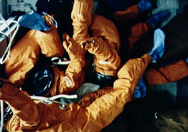 ![]() | Spacecraft: EES. The initial series of shuttle flights were equipped with specially adapted SR-71 ejection seats for the two crew. The crew were provided with space suits, derived from the USAF SR-71 suits, which provided them with some protection in the event of ejection or cabin depressurization. The suit was a modified S1030A with an anti-G system. After the initial flights, and until the Challenger disaster, the crew was provided only with oxygen masks. |