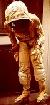 ![]() | Spacecraft: Krechet. The Krechet spacesuit was designed by the Zvezda OKB for use on the lunar surface. It consisted of flexible limbs attached to a one-piece rigid body / helmet unit. The suit was entered through a hatch in the rear of the torso. The exterior of the hatch housed the life support equipment. Maximum operation time was ten hours. The Krechet space suit was designed for use on the lunar surface. As in the Orlan suit still used on Mir, the cosmonaut entered the suit by swinging open a hatch in the hard abdomen of the suit at the rear. The backpack containing the life support system was integrated with the hatch. As in Apollo, the gold-coated outer visor of the helment reflected ultra-violet radiation. The integrated Kretchet design meant that no external hoses were required as in the American Apollo suit. |