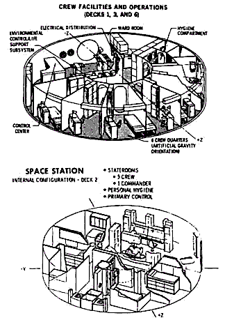 ![]() | Spacecraft: Space Station. NASA�s baseline Space Station of 1970, which was to be operational at early as 1977, was a large earth orbiting laboratory having a crew of 12 and a minimum operational lifetime of 10 years with resupply flights every 90 days. The station would be launched, unmanned, by an Saturn INT-21 (modified two-stage Saturn V). The station would be activated after completion of initial rendezvous and docking operations by the space shuttle. |