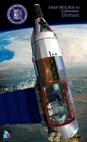![]() | Spacecraft: MOL. MOL (Manned Orbiting Laboratory) was the US Air Force's manned space project after Dynasoar was cancelled, until it in turn was cancelled in 1969. The earth orbit station used a helium-oxygen atmosphere, a Gemini capsule accomodating a crew of two for ascent and reentry, and the Gemini retrofire package to return the crew to earth. MOL normally would have remained attached to the Titan III transtage, which would provide it up to 760 m/sec of maneuver capability. Experiments planned ranged the gamut from military reconnaisance using large optical cameras and side-looking radar, through interception and inspection of satellites, to exploring the usefulness of man in space and test of Manned Maneuvering Units. After cancellation, some of the reconnaisance systems ended up in later KH series sattelites, and some of the manned experiements were accomplished on Skylab. |