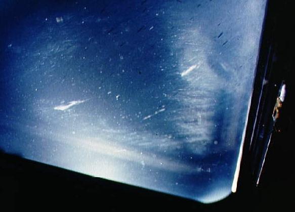 STS-8 Crew compartment flight deck window debris, damage, streak documentation Credit: NASA. File Name: 10061307.jpg. Image width: 583 pixels. Image height: 419 pixels. Image size: 28,315 bytes. |