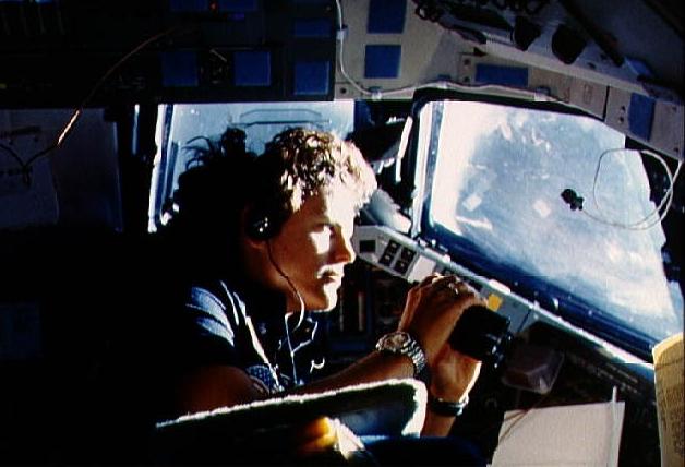 STS-41-G Astronaut Kathryn Sullivan using binoculars for magnifed viewing of earth Credit: NASA. File Name: 10061845.jpg. Image width: 628 pixels. Image height: 428 pixels. Image size: 39,396 bytes. |