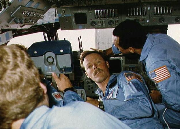 STS-61-C Four STS 61-C crewmembers gather at the commander's station Credit: NASA. File Name: 10062634.jpg. Image width: 624 pixels. Image height: 446 pixels. Image size: 52,632 bytes. |
