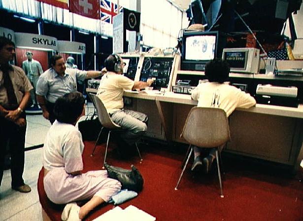 STS-51-F Kathleen England watches her image transmitted to shuttle Credit: NASA. File Name: 10062681.jpg. Image width: 615 pixels. Image height: 448 pixels. Image size: 56,162 bytes. |
