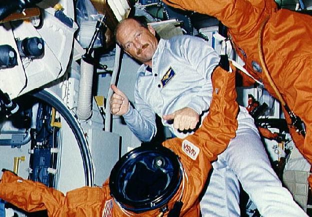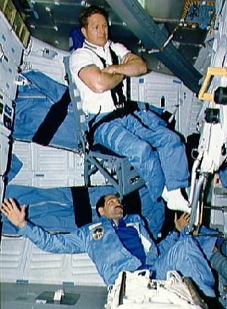 STS-27 STS-27 crewmembers perform balancing act on middeck Credit: NASA. File Name: 10063077.jpg. Image width: 327 pixels. Image height: 444 pixels. Image size: 41,946 bytes. |