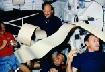 STS-26 STS-26 crewmembers eat on middeck as TAGS printout drifts among them Credit: NASA. File Name: 10062989.jpg. Image width: 621 pixels. Image height: 430 pixels. Image size: 49,172 bytes. |