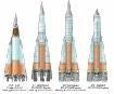 ![]() | Launch Vehicle: G-2. The G-2 design objective was to create the first IRBM - to deliver a 1000 kg payload over a 2500 km range. The missile would use three V-2 derived engines with a total thrust of 100 tonnes. A variety of alternate configurations (R-12A through R-12K) were considered by the German team in Russia. These included parallel and consecutive staging, gimballed motors, and other innovations. The R-12K was particularly interesting because it represented a concept later used on the US Atlas missile - jettisoning of the two outboard engines at altitude to significantly improve range. The G-2 was given the secret designation R-6 and overt designation R-12 by the Russians. |