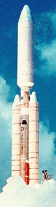 | Launch Vehicle: Titan 34D. Stretched Titan core with 5 1/2 segment solid rocket motors. IUS (Interim/Inertial Upper Stage) solid upper stages or used without upper stages. Commercial Titan 3, marketed in 1990's, was a modification of the 34D. |