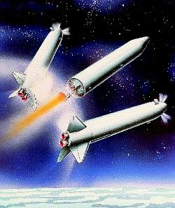 ![]() | Launch Vehicle: STS-2000 TSTO. Two stage to orbit horizontal takeoff / horizontal landing variant of STS-2000. Ramjet/rocket mixed power first stage. Mach 6 separation of rocket-powered second stage. French study of the 1980's. |