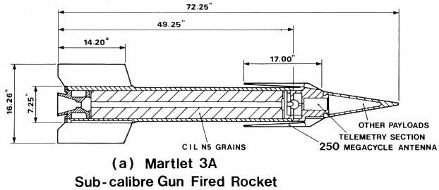 The Martlet 3A was the first serious attempt to produce a sub-calibre, gun-launched, rocket-assisted, vehicle for the 16 inch gun system. The basic design criteria for the Martlet 3A was to gun launch a vehicle containing a rocket motor that could provide a velocity boost equal to or greater then the initial gun-launch velocity.
