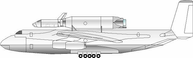 The Spiral project was not cancelled with the decision to proceed with the large Buran spaceplane. Instead flight test of the orbiter continued but the launcher design was rethought. The ambitious Mach 4 air-breathing first stage was abandoned in favour of launch from an existing subsonic heavy transport. The first iteration of the new design was undertaken in 1977-1978 as the AKS project at the Scientific Research Institute 'Rosa'. This used the second rocket stage and orbiter stage of Spiral, designated RUOS in this study. This design was the starting point that would evolve through the System 49 and Bizan designs, finally resulting in the MAKS of 1988.